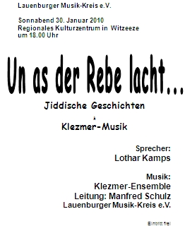 -->Zum Artikel von Silke Geercken in den Lübecker Nachrichten v. 02.02.2010 "Und wenn der Rebe singt (tanzt, weint, pfeift, schweigt, schimpft, schläft, schnarcht, niest, lacht), singen (tanzen, weinen ... ...) alle Chassidim." Mit diesem bekannten jiddischen Lied begannen die Klezmorim des Lauenburger Musik-Kreises ihren Auftritt am Samstag, d. 30 Januar in Witzeeze. Es schien an diesem Abend so, als ob das Wetter sich gegen die Musiker verschworen hatte. Große Schneemassen versperrten die Straßen, es war eisig kalt und viele Gäste hatten abgesagt. Umso erstaunlicher war es, dass der Saal im regionalen Kulturzentrum trotzdem bis auf den letzten Platz besetzt war. Viele Witzeezer waren gekommen, aber auch Gäste aus Büchen, Lauenburg, Lüneburg und sogar Hamburg hatten sich nicht durch das Wetter abhalten lassen . Und sie wurden nicht enttäuscht. Lothar Kamps bot die Geschichten zur Musik mit Tiefsinn aber auch mit viel Witz. Die Musiker übertrafen sich selbst, angefeuert durch ein verständiges, aufmerksames und sehr interessiertes Publikum. Manfred Schulz, künstlerischer Leiter: "Das Konzert hat uns großen Spaß gemacht. Wir danken den Witzeezern, dass sie uns so nett aufgenommen haben und freuen uns deshalb schon auf das nächste Konzert am 19. Juni in Witzeeze mit dem Titel "AFRICA" mit unserem Chor, der Big Band und Trommelgruppe TAKOMBA."